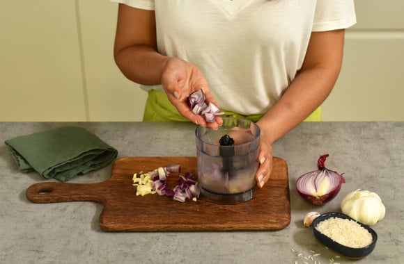 4Préparez la sauce : pelez et coupez l’oignon et la gousse d’ail en deux, versez-les dans un bol mixer.
