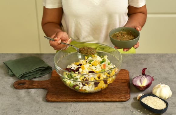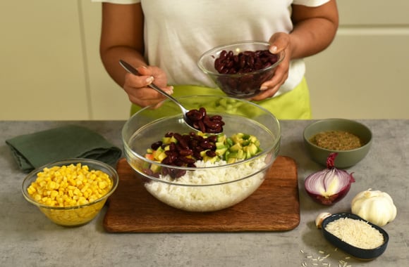 7Mélangez le riz basmati , les haricots rouges, le maïs, les dés de tomates et d'avocats.