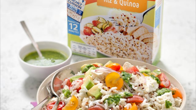 Faites cuire 3 sachets cuisson de Riz & Quinoa Uncle Ben’s ® pendant 10 min dans un grand volume d’eau bouillante salée. Egouttez les sachets, ouvrez-les et versez le riz et quinoa dans une passoire, puis passez-les sous l’eau froide.