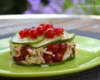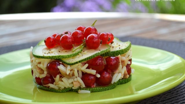 Disposez un emporte-pièce sur les assiettes, étalez-y quelques tranches de courgette dans le fond, ajoutez la salade de riz et terminez avec quelques tranches de courgettes. Retirez-l'emporte-pièce et décorez avec les groseilles réservées...