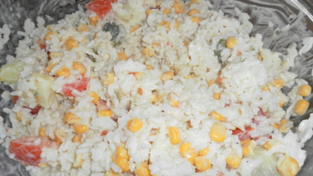Mélanger dans un saladier le riz, les morceaux de pommes de terre, tomates, maïs, cornichon, et la sauce.
