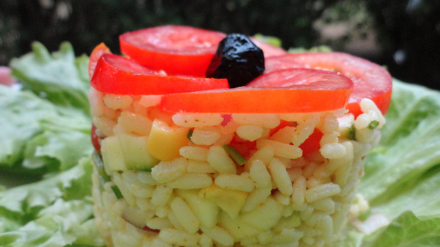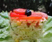 Faire cuire le riz dans de l'eau salée, et le laisser refroidir. Pendant ce temps découper les tomates cerises en quartier et les poivrons landais trés finement. Ajouter le maïs égoutté et rincé. Découper la courgette et l'oignon rouge en fine brunoise. Mélanger le tout avec le riz froid.