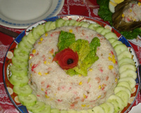 Mélanger dans un saladier la charcuterie ( de préférence de la mortadelle et du jambon de dinde) coupée en petits dés avec la tomate les cornichons ou olives vertes et le maïs, réserver.