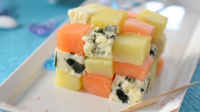 Présentez les cubes de pommes de terre, le melon et le roquefort empilés les uns sur les autres comme un rubik's cube.