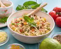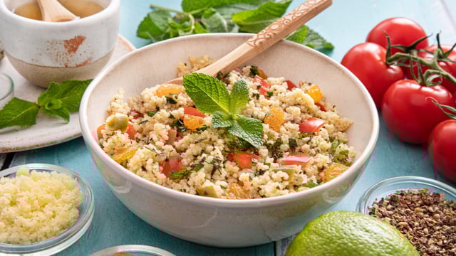 Rajouter les deux verres de semoule, les aromates, le sel le poivre et un peu de vinaigrette selon votre goût ! Laisser gonfler 30 minutes en remuant de temps en temps.