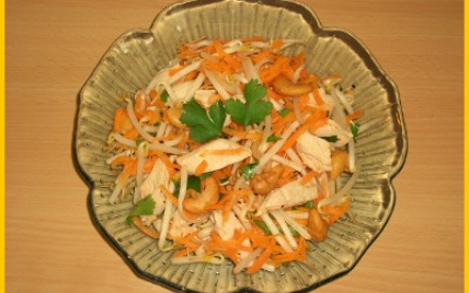 Pelez et râpez les carottes puis mélangez-les avec le soja, les morceaux de poulet froids, les noix de cajou, l'huile d'olive et le jus du citron.