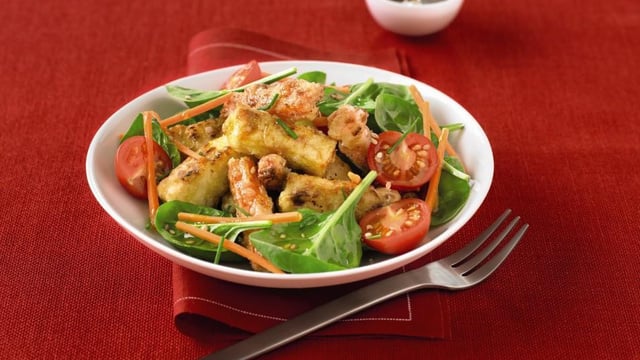 Préparer une assiette avec la fécule et une assiette avec l'œuf battu. Faire rissoler les morceaux de tofu et les morceaux de carotte dans l'huile chaude en les passant au préalable dans l'œuf battu puis la fécule.