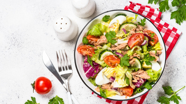 Répartissez le mesclun dans 4 assiettes, ajoutez le mélange tomates-concombre et thon puis le persil plat et les oeufs durs.