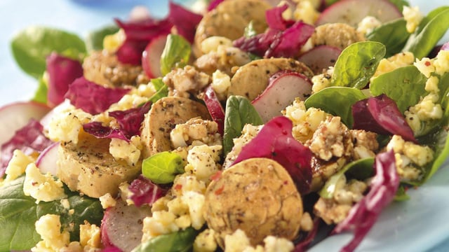 Nettoyer et essorer la salade et les épinards. Couper les Tofinelle en dés ou en rondelles.