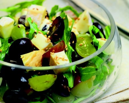 Rajoutez le Reblochon, les raisins et la roquette. Mélangez délicatement, parsemez de graines de sésame et servez aussitôt.