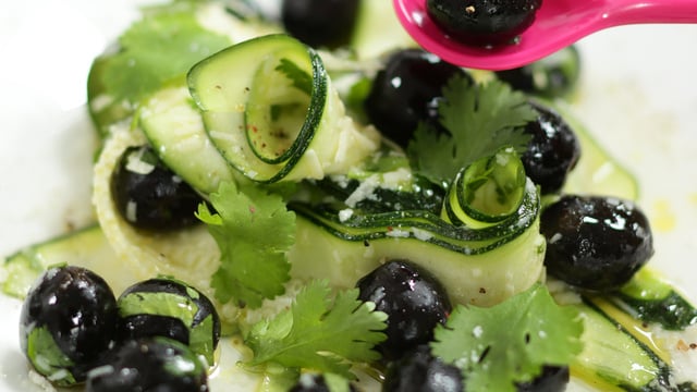 Disposer les tagliatelles de courgettes obtenues dans un saladier en ajoutant la mixture d'olives infusée, du sel et du poivre.
