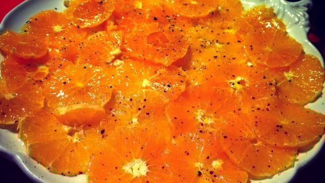 Peler les oranges à vif et les couper en tranches fines, puis découper les tranches en quatre morceaux. Les mettre dans un saladier ou dans des coupes individuelles.