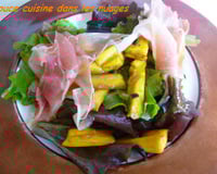 - 3Dresser les assiettes : salade, champignons chauds, arroser de vinaigrette puis poser une tranche de jambon.