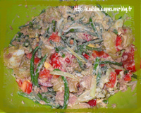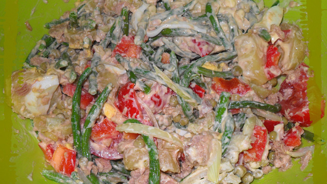 Égouttez les petits pois, les haricots verts. Otez les graines et cloisons du poivron que vous couperez en cubes. Coupez les oeufs en rondelles ainsi que les pommes de terre et l oignon. Coupez les tomates en cubes. Égouttez et émiettez le thon.