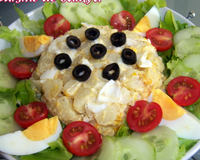 Verser la préparation dans un bol et appuyant bien avec le dos d'une cuillère pour tasser, et hop on retourne au milieu de l'assiette à salade. Décorer avec l'oeuf restant coupé en quartiers et les rondelles d'olives.