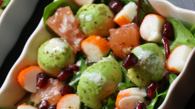 Réaliser des billes d'avocat avec une cuillère parisienne. Disposer la salade sur les assiettes de service. Ajouter l'avocat, du pamplemousse et du surimi. Parsemer de graines de grenade.
