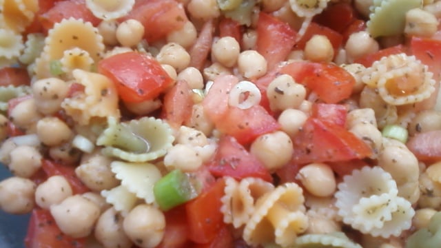 Faire cuire les pâtes. Les égoutter et les mélanger avec les pois chiches égouttés.