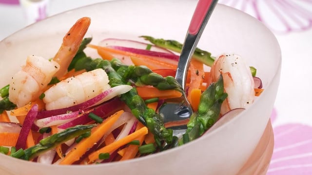Rincer les asperges et couper les en 2 dans la longueur. Couper les ensuite en 4 dans l'épaisseur de manière à obtenir des bâtonnets. Faites de même avec les carottes. Décortiquer les crevettes ou gambas.