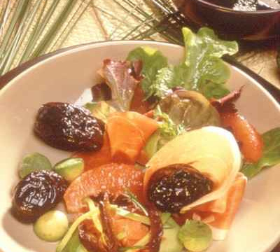 - Sur chaque assiette, disposer 3 belles feuilles d'endive en croix, puis ajouter le mesclun déjà assaisonné. Disposer 3 tranches de canard fumé ainsi que le jambon coupé en morceaux. Prendre une orange et un pamplemousse entiers, préalablement pelés à vif pour obtenir de beaux quartiers entiers et les parmeser dans la salade de manière à apporter de la couleur. Ajouter ensuite ls pruneaux dénoyautés et chauds.