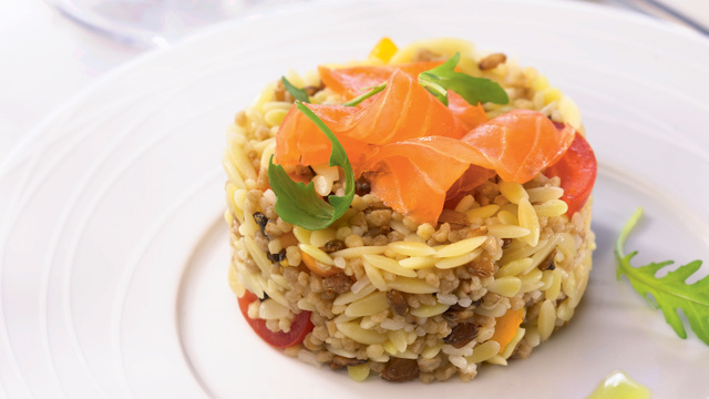 Découpez les tranches de saumon en lanières, les tomates cerises en quatre. Ajoutez le saumon, les tomates et la roquette aux Céréales de Campagne et mélangez.