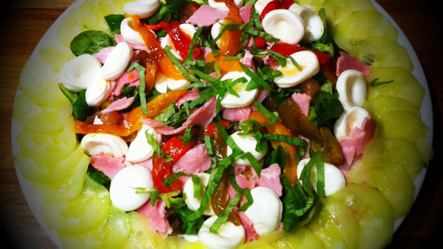 Au centre de l'assiette, déposer une grosse poignée de mâche bien lavée et nettoyée, disposer dessus les oignons, le jambon, la mozzarella et les lanières de poivrons. Disposer les tranches de concombre en rosace tout autour. Assaisonner avec sel, poivre, de l'huile extra-vierge d'olive et du vinaigre balsamique. Ciselez dessus des feuilles de basilic frais.