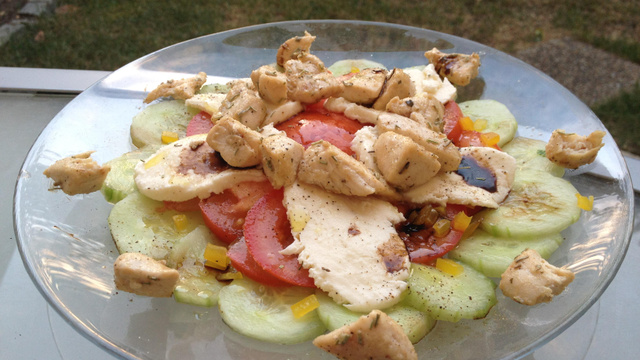 Salade de concombres, avec de la mozzarella et du poulet revenu à la poêle.