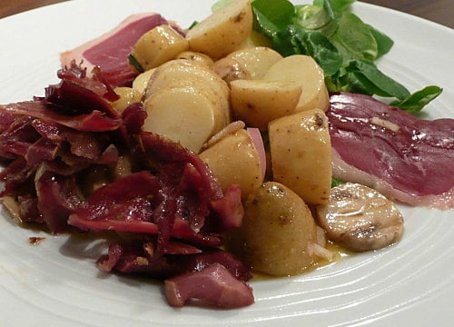 Dans un saladier, mettez les pommes de terre, les magrets de canard, les girolles, les champignons de Paris émincés crus, les gésiers confits et l'échalote coupée finement .