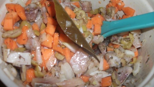 Coupez également en morceaux l'emmental. Coupez les filets de harengs en petits tronçons.