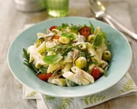 Une salade aux saveurs méditerranéennes : des pâtes cuites 'al dente', des tomates cerises, des dés de mozzarella, de la roquette, du thon, des olives... et bien sur du basilic et une bonne mayonnaise !