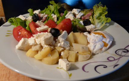 Dresser l'assiette : mettre la salade verte puis les pommes de terre et la tomate, l'oeuf, les lardons, la feta et les olives noires... ajouter la vinaigrette en léger filet.