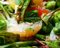 Mélangez alors tous les ingrédients de la salade dans un plat, l'orange et le pamplemousse, les fèves, les feuilles de menthe et les pousses de salade, le fenouil. Saupoudrez le tout avec les noisettes hachées.