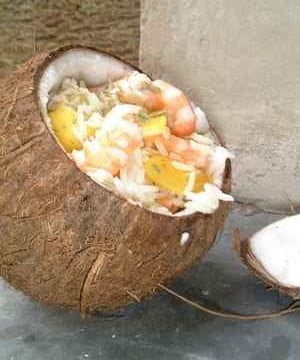 2/ Récupérer la pulpe de la noix au couteau puis la râper. Faire la salade en mélangeant les crevettes, la mangue coupée en morceaux, le riz, la coriandre, la pulpe de la noix de coco et l'huile d'olive.