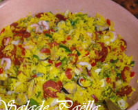 Dans un grand saladier, mettez le riz, les légumes, les viandes et fruits de mer, salez, poivrez, ajoutez une bonne pincée de piment d' Espelette, bien mélanger le tout.