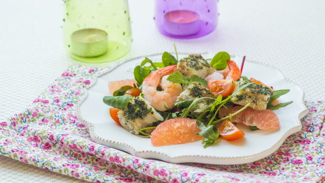 Dressez les assiettes avec la salade, les crevettes, les suprêmes de pamplemousse, les tomates cerises coupées en quartiers et les cubes de poisson. Nappez de vinaigrette, ajoutez quelques herbes fraîches ciselées et servez.