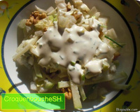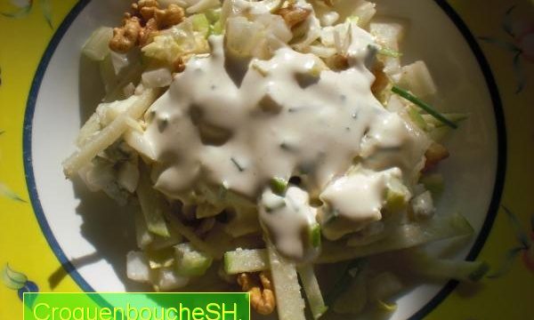 Une salade avec du fromage, des noix et des chicons très agréable au goût.