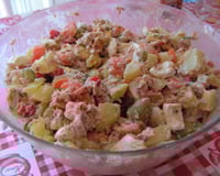 Vous adorez les pommes de terre et vous voulez faire une salade qui change de l'ordinaire ? Cette recette de salade russe est facile à faire et elle peut vous dépanner pour un repas du midi ou du soir. Après avoir fait cuire des pommes de terre, des carottes et des œufs dans de l'eau bouillante, vous allez procéder à la découpe de tous les autres ingrédients. Aussi, pour donner des couleurs et du croquant à votre salade, vous allez rajouter quelques olives, des poivrons, mais aussi des cornichons. À la dernière minute, mélangez tout dans un saladier et n'oubliez pas d'émietter le thon. Enfin, vous allez assaisonner le tout avec une mayonnaise légère et délicieuse maison. Pour ce faire, vous avez besoin de moutarde, de fromage blanc et de persil. C'est un délice !