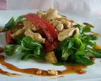 Mélanger l'assortiment de salade avec les zestes de cumbava ainsi que la brunoise de gingembre et pour finir la brunoise d'abricot et de pruneau. Dresser dans l'assiette y ajouter les poivrons, le poulet et pour terminer disposer autur la sauce au thé ainsi que la sauce au miel.