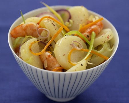 Saveurs originales pour une salade de pommes de terre et crevettes.