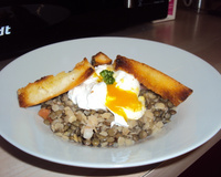 - Cuire les lentilles avec la poitrine, la carotte et l'oignon.Détailler le saumon en dés, reserver au fraisCiseler la ciboulette, mélanger avec le saumonLorsque les lentilles sont cuites, égoutter en reservant le jus de cuisson, la poitrine et la carotte.Laisser reposer jusqu'a 50°C, puis mélanger avec la ciboulette et le saumon, rectifier l'assaisonnement et reserver à température ambiante.Pocher les oeufs, ebarber et réserver à 60°C.Dans le blender, mettre le jus de citron, la pulpe du citron vert, la carotte, le sel, le poivre, l'huile d'olive et mixer l'ensemble.Ajouter petit à petit du jus de cuisson des lentilles et mixer pour obtenir une sauce liée, onctueuse et pas trop acide.Dresser la salade au centre d'une assiette creuse, poser l'oeuf sur le dessus de la "salade" et saucer le tour de la salade.Juste à l'envoi, inciser l'oeuf de façon à voir le jaune couler lors du service.