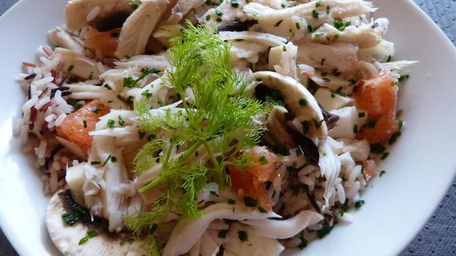 Couper les champignons en lamelles. Faire cuire le riz 15 min puis le passer sous l'eau froide. Éplucher le pamplemousse et le couper en quartiers. Couper le fenouil en lamelles.