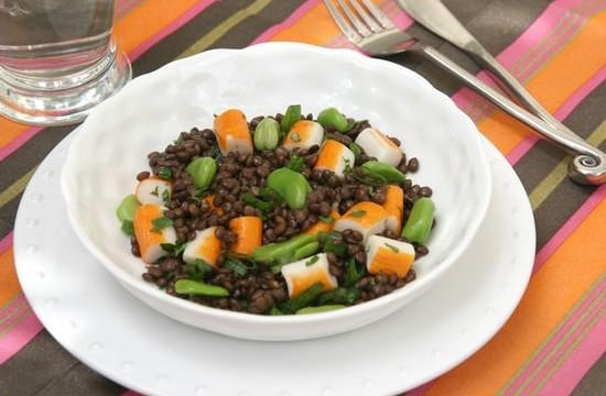 Egoutter les lentilles. Dans un saladier, mélanger les lentilles encore chaudes, à la vinaigrette. Laisser tiédir puis ajouter les cives, les fèves et les dés de surimi. Rectifier l'assaisonnement et servir tiède ou froid.