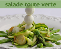 Des légumes verts et des billes de mozarella sous une sauce verte bien relevée pour une salade de printemps.