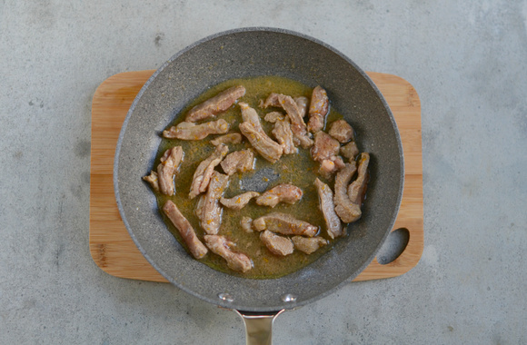 5Dans une poêle, faites chauffez 2 cuillères à soupe d'huile d'olive et faites cuire les lamelles d'agneau pendant 6 minutes.