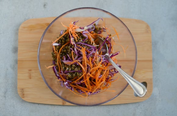 8Lorsque les lentilles sont cuites, mais encore un peu fermes, mélangez-les avec le chou rouge émincé et les carottes que vous avez préalablement râpées. Arrosez de vinaigrette et laissez macérer 30 minutes à température ambiante.