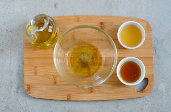 7Préparez la vinaigrette : mélangez l’huile, le vinaigre, le miel, 1 pincée de sel et du poivre.