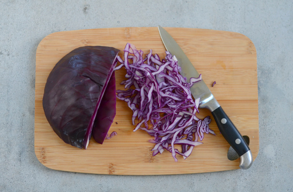 4Ôtez la côte centrale du chou et émincez-le finement à la mandoline.