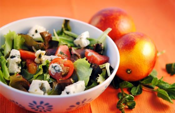 Lavez votre salade et réservez-là dans des assiettes. Découpez des cubes de votre pastèque et enlevez les pépins. Lavez les tomates cerises et coupez les en deux ou en quatre selon leur taille. Pelez à vif l'orange sanguine en prenant soin d'enlever les filaments, prélevez 4 à 6 quartiers (appelés suprêmes). Coupez-les ensuite en petits dés. Coupez le Roquefort en dés. Mélangez tous les ingrédients avec votre salade.