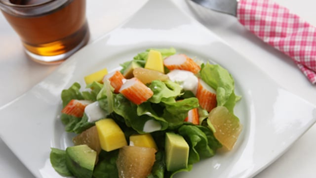 Dans chaque assiette disposer quelques feuilles de salade. Parsemer de dès de mangue, Coraya Suprêmes, avocat et pamplemousse.