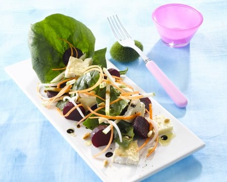 Coupez les carottes en julienne, les betteraves en rondelles et les pommes en allumettes.