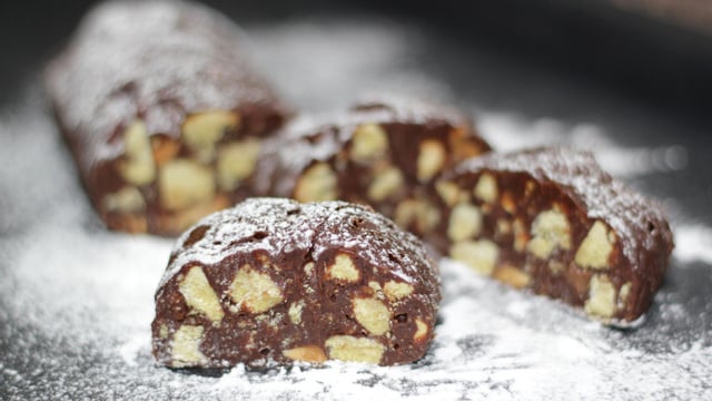 Un saucisson trompe-l'oeil ! Un délicieu gâteau sans cuisson au chocolat, à dévorer du bout des doigts...